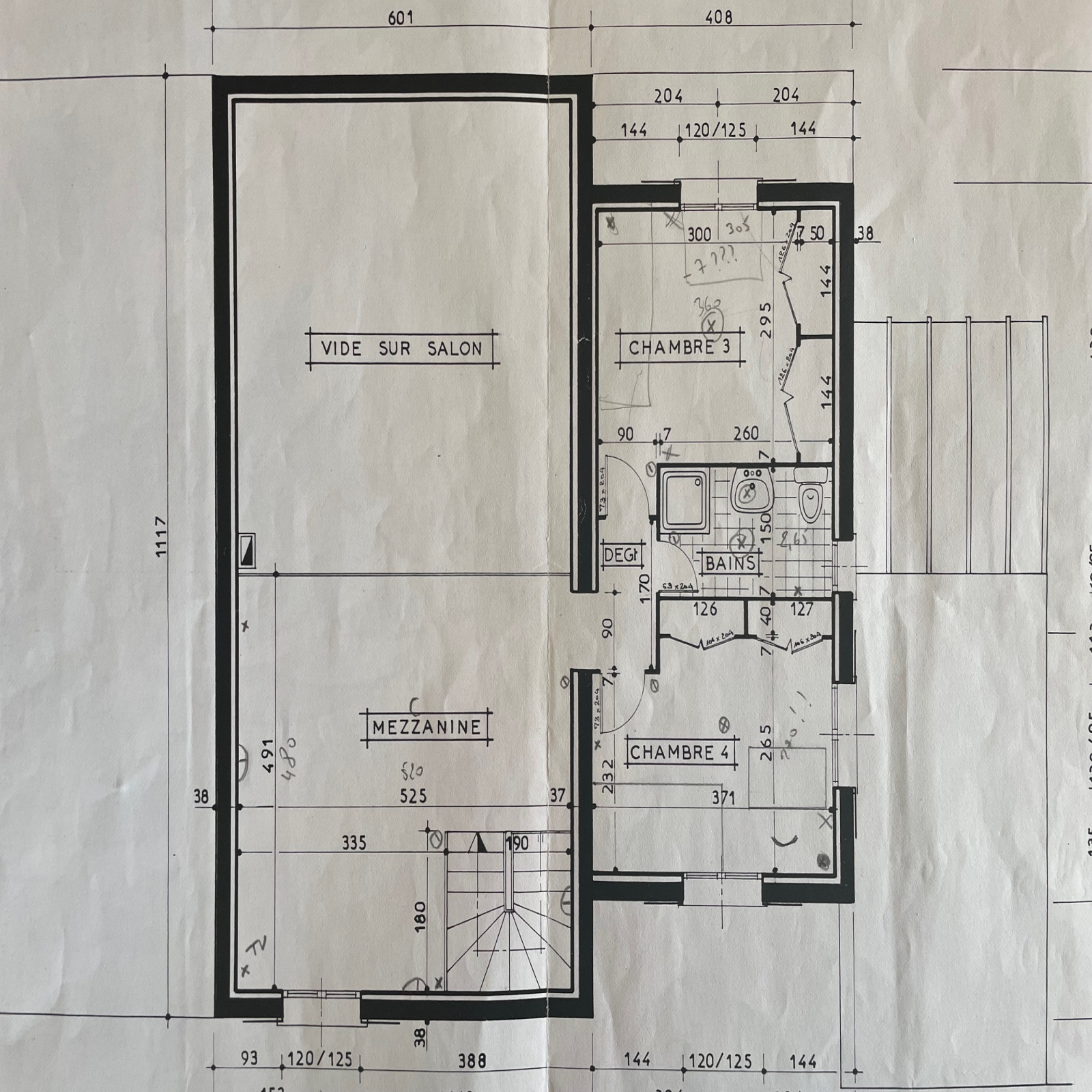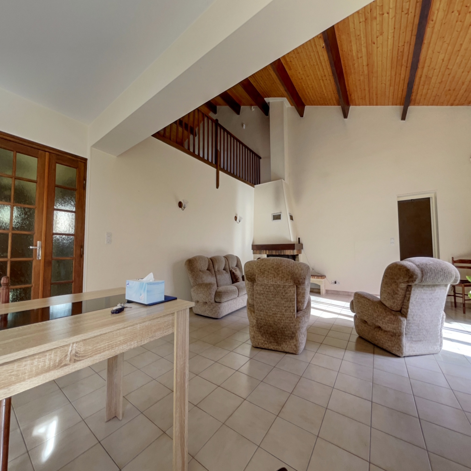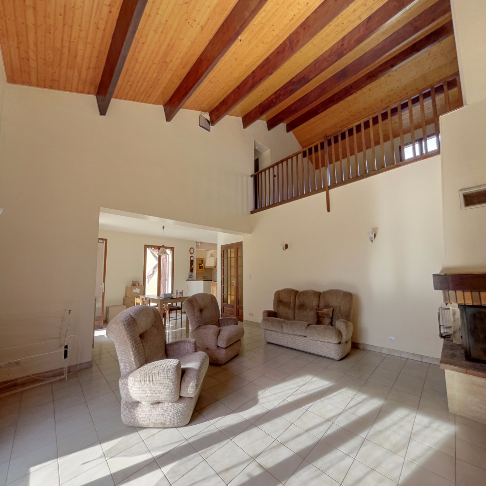 A l'étage : 2 chambres, salle de bains wc et grande mezzanine.